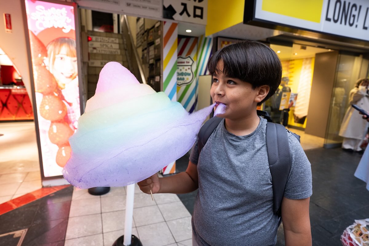Cotton candy in every color, giant matcha crepes, kawaii donuts, stacked donuts, tanghulu, and 2D/3D lattes โ kids go crazy!